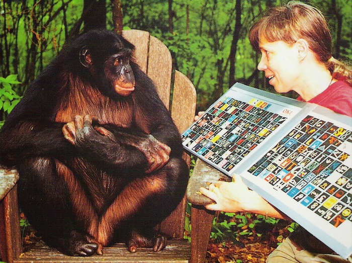 İşarət dilini öyrənməyə cəhd edilən digər bir primat erkək bonobo şimpanzesi Kanzidir. Böyük Meymun Tədqiqat Fondu (ABŞ) tərəfindən aparılan bir təcrübədə məşhur erkək Kanziyə qulaqla təxminən 3000 ingilis sözünü başa düşmək və insan leksiqramları (sözləri təmsil edən simvollar) olan klaviaturadan istifadə edərək 500-dən çox sözdən aktiv şəkildə istifadə etmək öyrədilib.