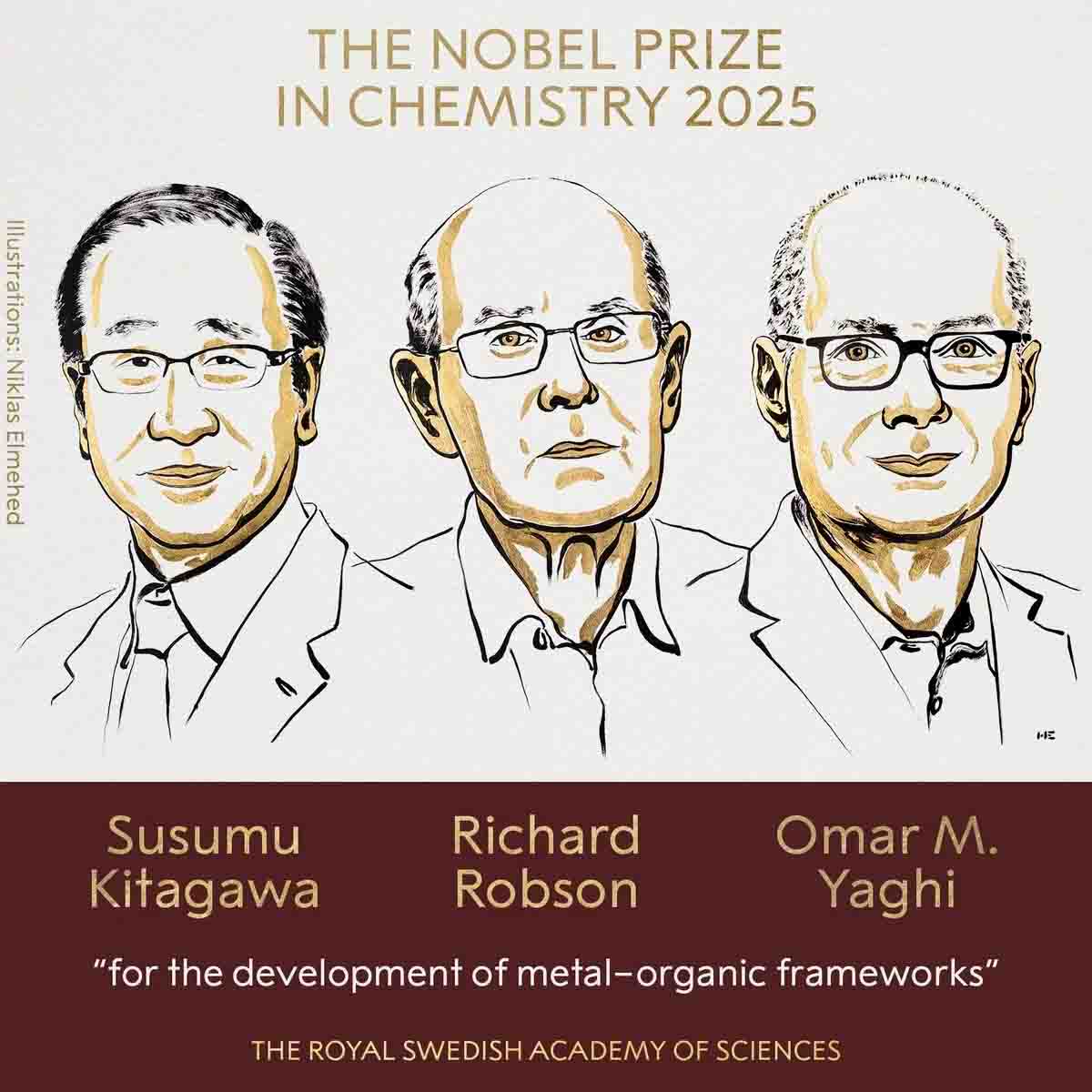 Kimya üzrə Nobel Mükafatı alimlər Susumu Kitagava (Kyoto Universiteti,Yaponiya), Riçard Robson (Melburn Universiteti,Avstraliya) və İordaniya əsilli amerikalı kimyaçı, Berklidəki Kaliforniya Universitetinin kimya professoru Ömər M. Yaqiyə (Berkli Universiteti, ABŞ) “metal-üzvi strukturların inkişafına görə” verilib. Bu barədə mükafatın sosial media hesablarında məlumat verilib.