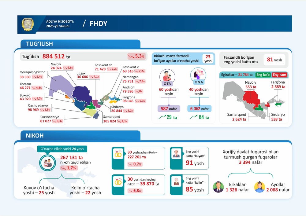 Eyni zamanda, Özbəkistan vətəndaşları arasında nikahların sayı azalır. 2025-ci ildə 267.100 nikah qeydə alınıb ki, bu da 15 illik ən aşağı göstərici olan 2024-cü ildəki (271.800) nikahdan 1,7% azdır.