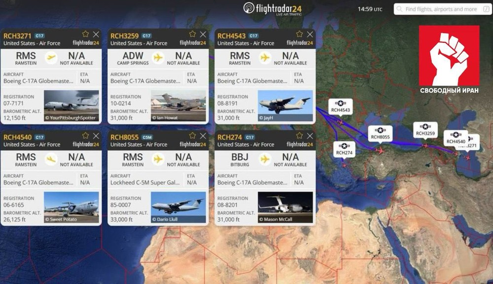ABŞ Hərbi Hava Qüvvələrinə məxsus C-17A Globemaster III və MC-130 Super Hercules hərbi nəqliyyat təyyarələri Türkmənistanın açıqlanmayan bir ərazisinə eniş edb. Bu barədə 9 fevralda Free Iran Telegram kanalı FlightRadar24 açıq uçuş monitorinq platformasına istinadən məlumat verib. Dəqiq eniş yeri açıqlanmayıb.