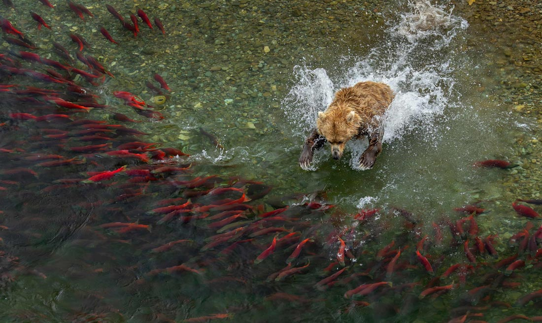 Alyaskanın Katmai Milli Parkında, qızılbalıqları tutmağa çalışan ayı...