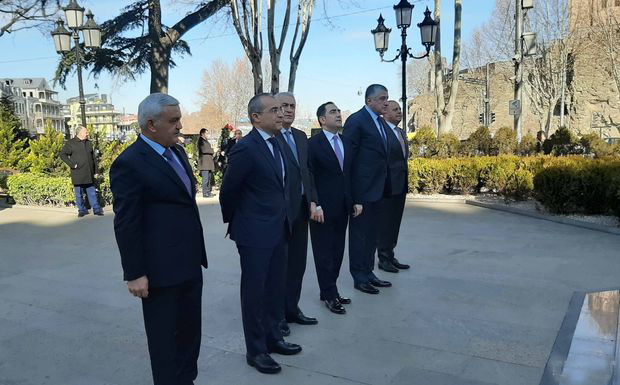 M.Cabbarov Azərbaycanın Gürcüstandakı səfiri Dursun Həsənov və səfirlik əməkdaşları ilə birlikdə Tbilisidə Heydər Əliyev adına parkda Ümummilli Liderin büstünü ziyarət edərək, önünə gül dəstələri qoyublar.