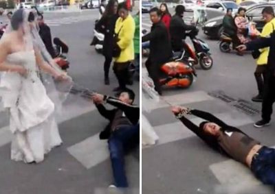 Hadisə Çində baş verib. Olay vaxtı gənc qız gəlinlik paltarında olub. O, oğlanın qollarını zəncirlə bağlayıb və küçə boyu sevgilisini sürüyüb. (teleqraf)
