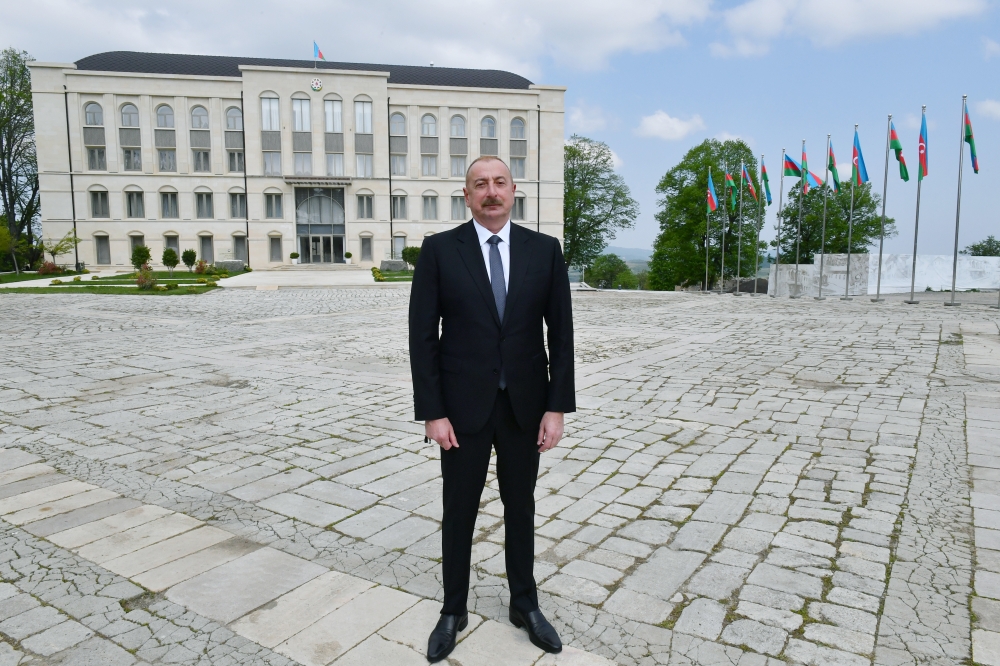Mən bu təbrik müraciətimi Bakıdan da edə bilərdim. Amma hesab etdim ki, mən bu gün burada olmalıyam, Şuşada olmalıyam, bu binanın önündə olmalıyam. Şuşa Zəfərimizin rəmzidir, Şuşa Zəfərimizin tacıdır. Şuşa işğaldan azad olunanda, bax, bu meydanda qəhrəman Azərbaycan hərbçiləri mənə Şuşanın azad olunması ilə bağlı raport vermişlər. Bu binanın damında Azərbaycan Bayrağı qaldırılmışdır və Şuşanın azad olunması bizim tarixi Zəfərimizin əsas hissəsi idi. Bildiyiniz kimi, ondan bir gün sonra Ermənistan kapitulyasiya aktına imza atmışdır.