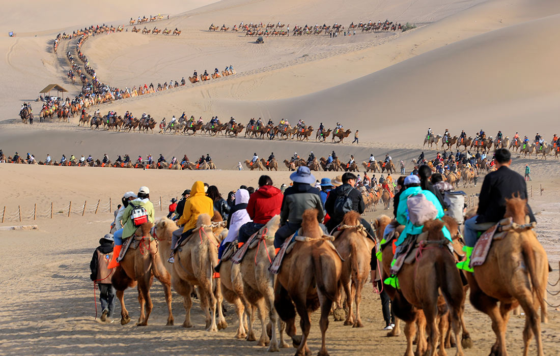 Turistlər Çində İpək Yolu üzərində dəvələrlə hərəkət edərkən...