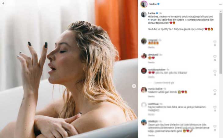 Yeni mahnısının çəkilişləri üçün hamam otağında yarıçılpaq vəziyyətdə poza verən Hadisə, mahnısının qısa müddətdə siyahıların başında olmasından dolayı təbriklər alıb. 14,4 milyon izləyicisi olan instaqram hesabından yeni görüntülər yayımlayan Hadisə, "Mənim hisslərimin, səsimin və ağlamağımın izləyicilərim arasında paylaşılacağını bilirdim! Bu qədər qısa zamanda "Fəryad" mahnısını 1 nömrəyə daşıdığınız üçün sizlərə sonsuz təşəkkürlər" deyib.