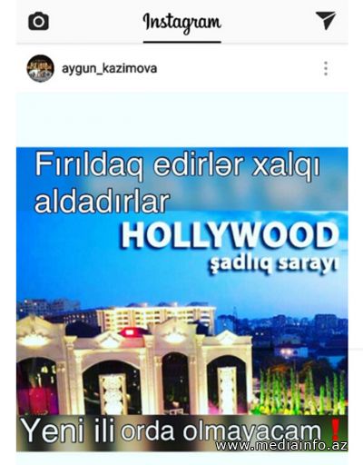 Yeni il şənlikləri yaxınlaşdıqca istirahət məkanları bayram tədbiri ilə bağlı reklam çarxları nümayiş etdirirlər. Kanallarda nümayiş etdirlən reklamlarda tanınmış müğənnilərin iştirak edəcəyi barədə məlumatlar yer alır. Mediainfo.az xəbər verir ki, şərurlu İsfəndiyara aid "Hollywood" şadlıq sarayı da istisna deyil. Bu məkanın bayram şənliyi ilə bağlı nümayiş etdirdiyi reklamlarda xalq artisti Aygün Kazımovanın da adı hallanır. Guya həmin məkanın təşkil edəcəyi bayram tədbirində o da çıxış edəcək.
